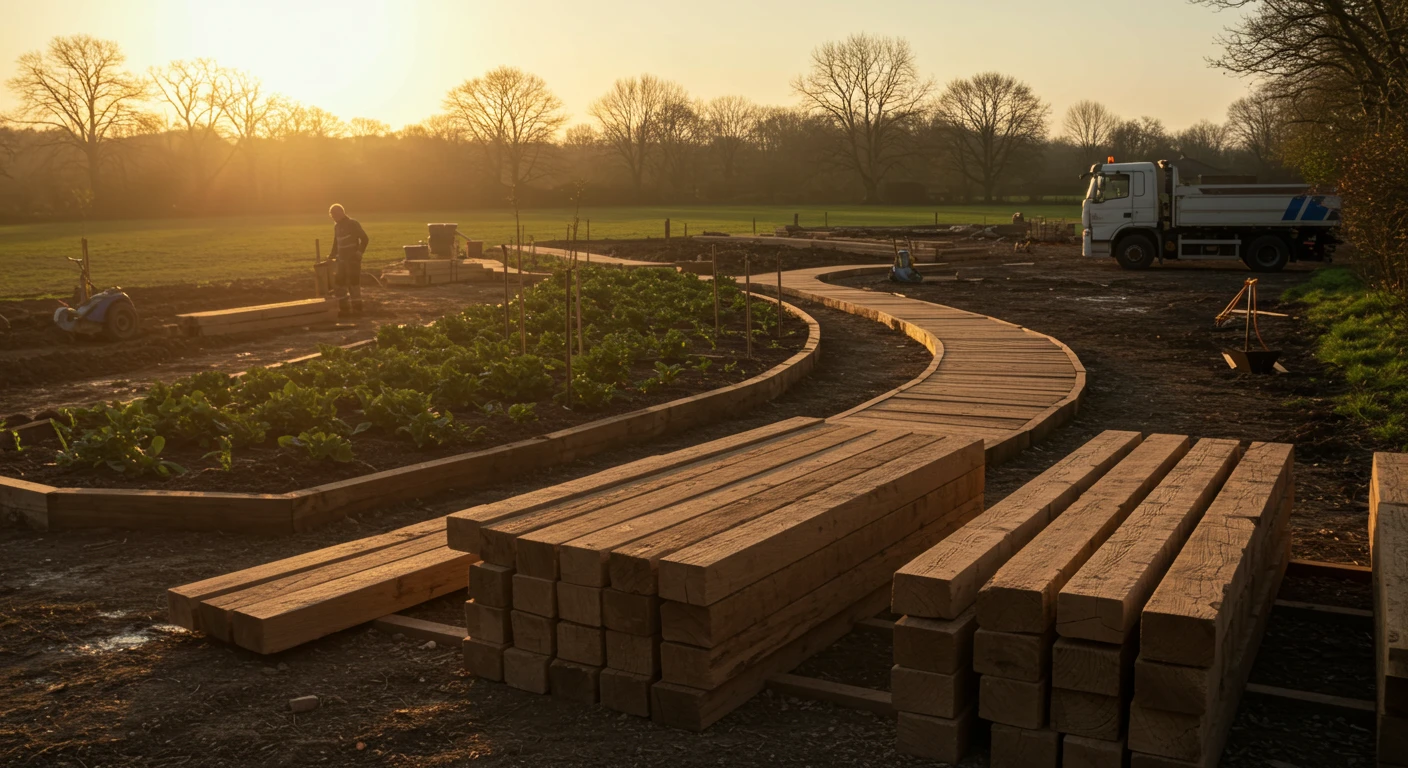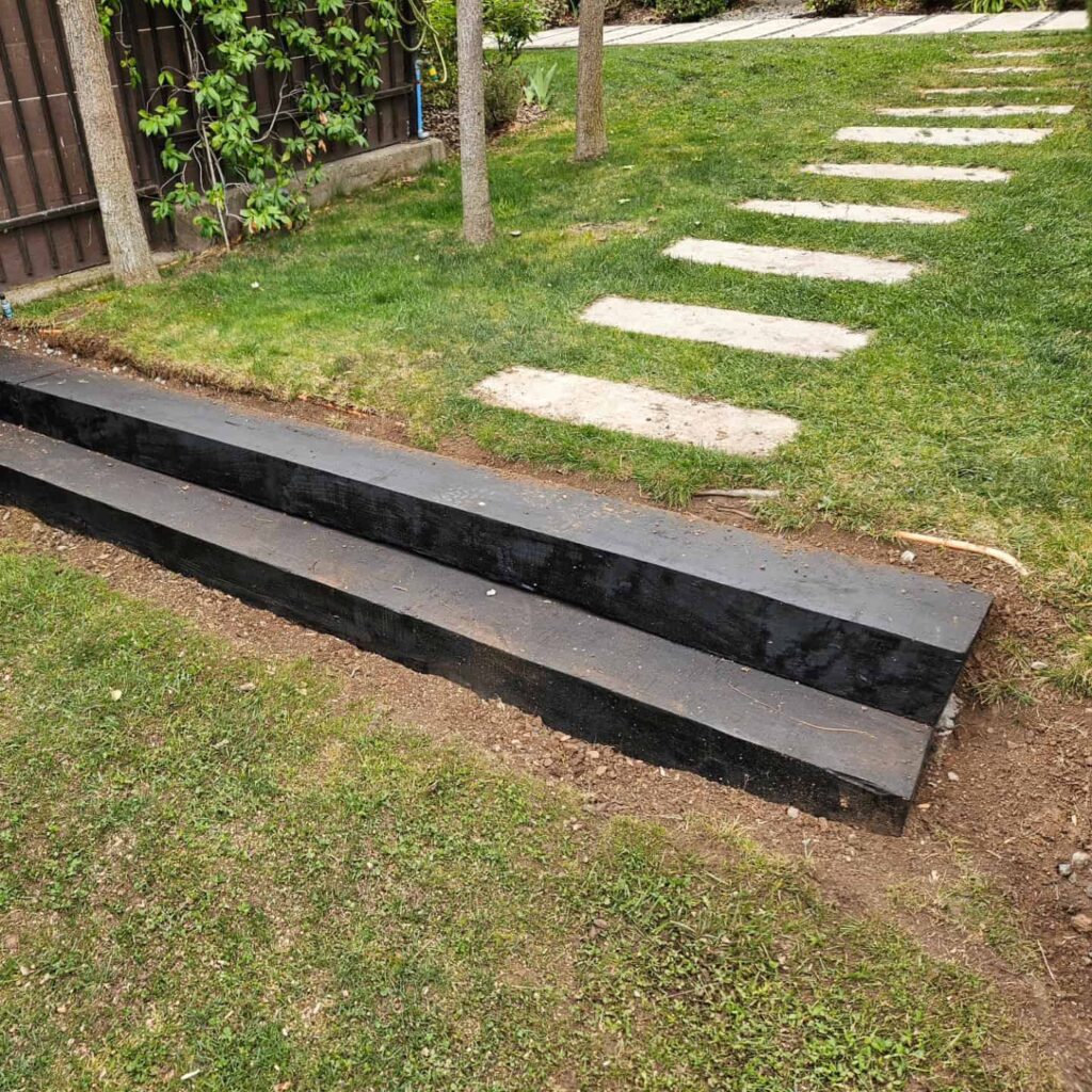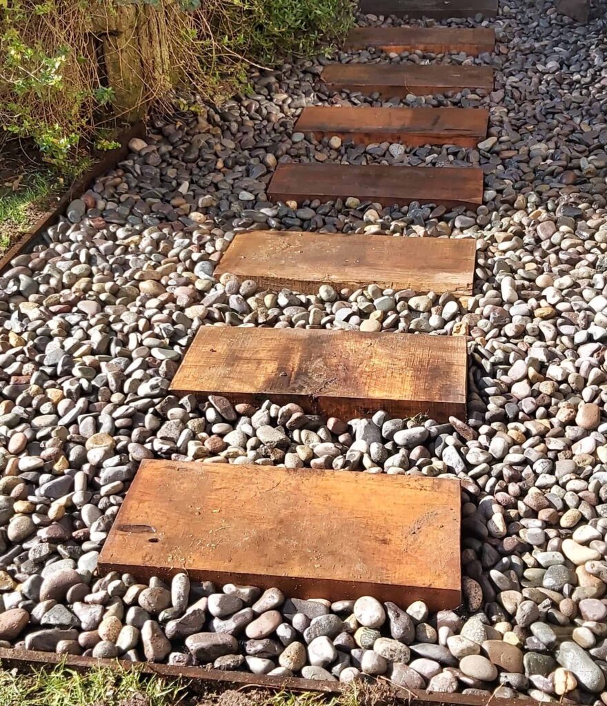 Durmientes, vigas y tablones instalados en jardines, senderos y proyectos rústicos. Cada imagen refleja la calidad, nobleza y resistencia de la madera nativa trabajada con dedicación y experiencia.
